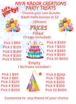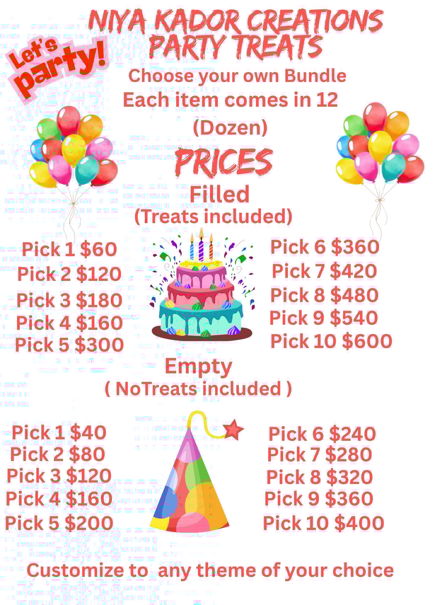 Elevate your party, Event, Wedding, Baby Shower, Brunch, Family Reunion, Birthday Party , Holidays etc. with our Customized Party Favor/Treats. Any theme or colors of your choice. Pick your bundle and at checkout in the comment section, Please tell us which Treats, Theme and colors ,Name added etc